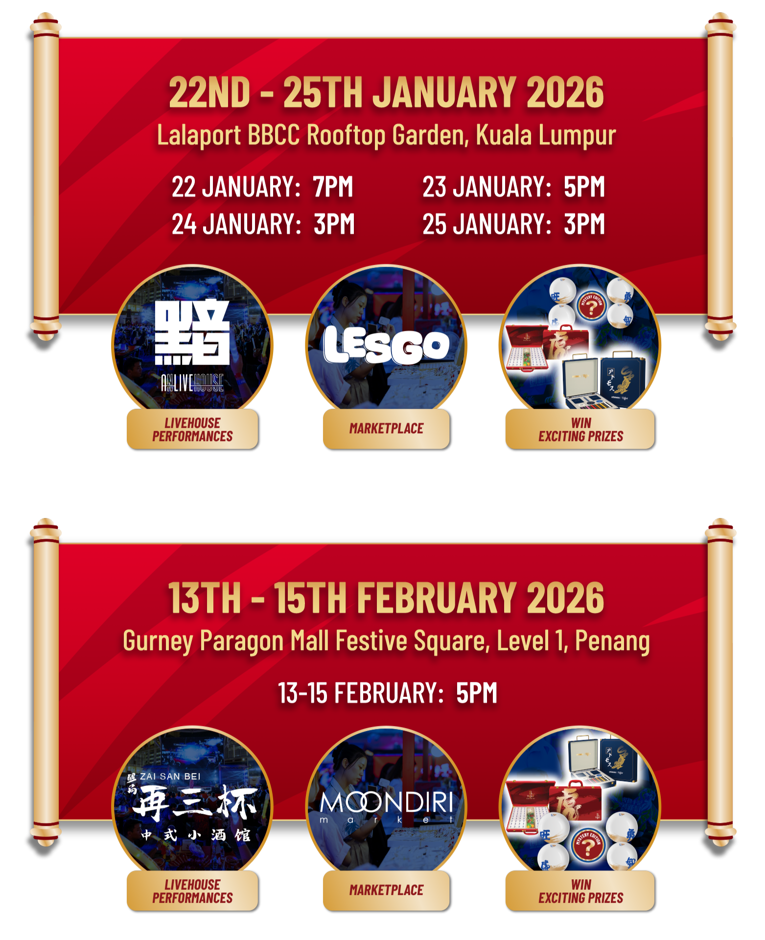 This year Tiger Town lands in both KUALA LUMPUR and PENANG. Get ready for livehouse performances, marketplace of food and art for CNY shopping, games with prizes waiting to be won, and ice-cold Tiger Beer!